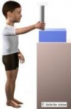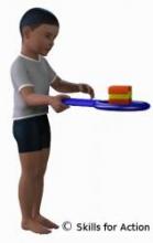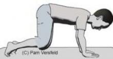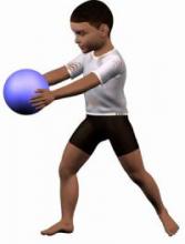 In these exercises the child lies prone on an exercise ball supporting on the arms. Moving forwards and bouncing on the ball are good ways to strengthen the trunk and arm muscles.